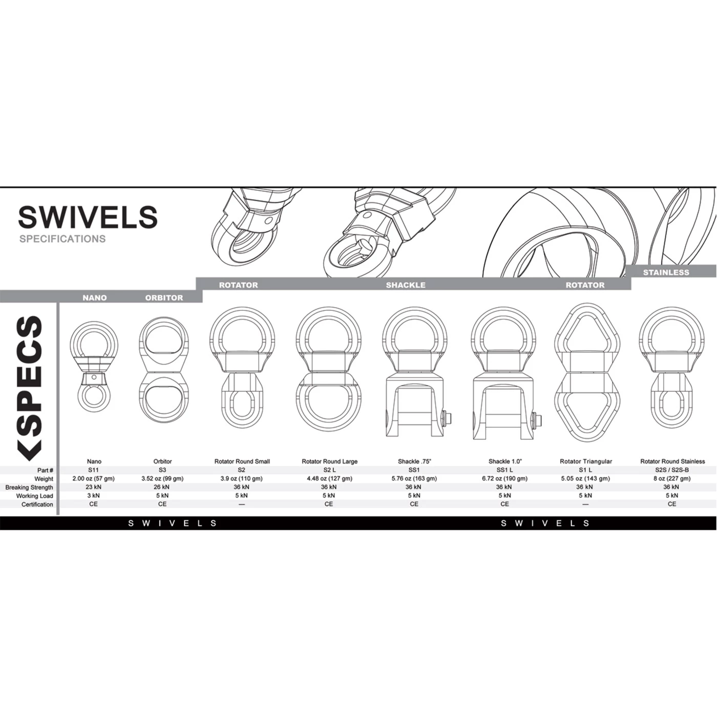 Rock Exotica’s Orbitor Swivel is a world-class, smooth-running swivel. This compact, low-profile swivel is ideal for special uses where a smooth form, minimum size and minimum weight are required. Rock Exotica designed and manufactured the first high-quality commercial swivels, and they now make the widest variety in the world. All of their swivels use high strength stainless axles and sealed ball bearings. Aluminum alloy end attachments. Made in USA.