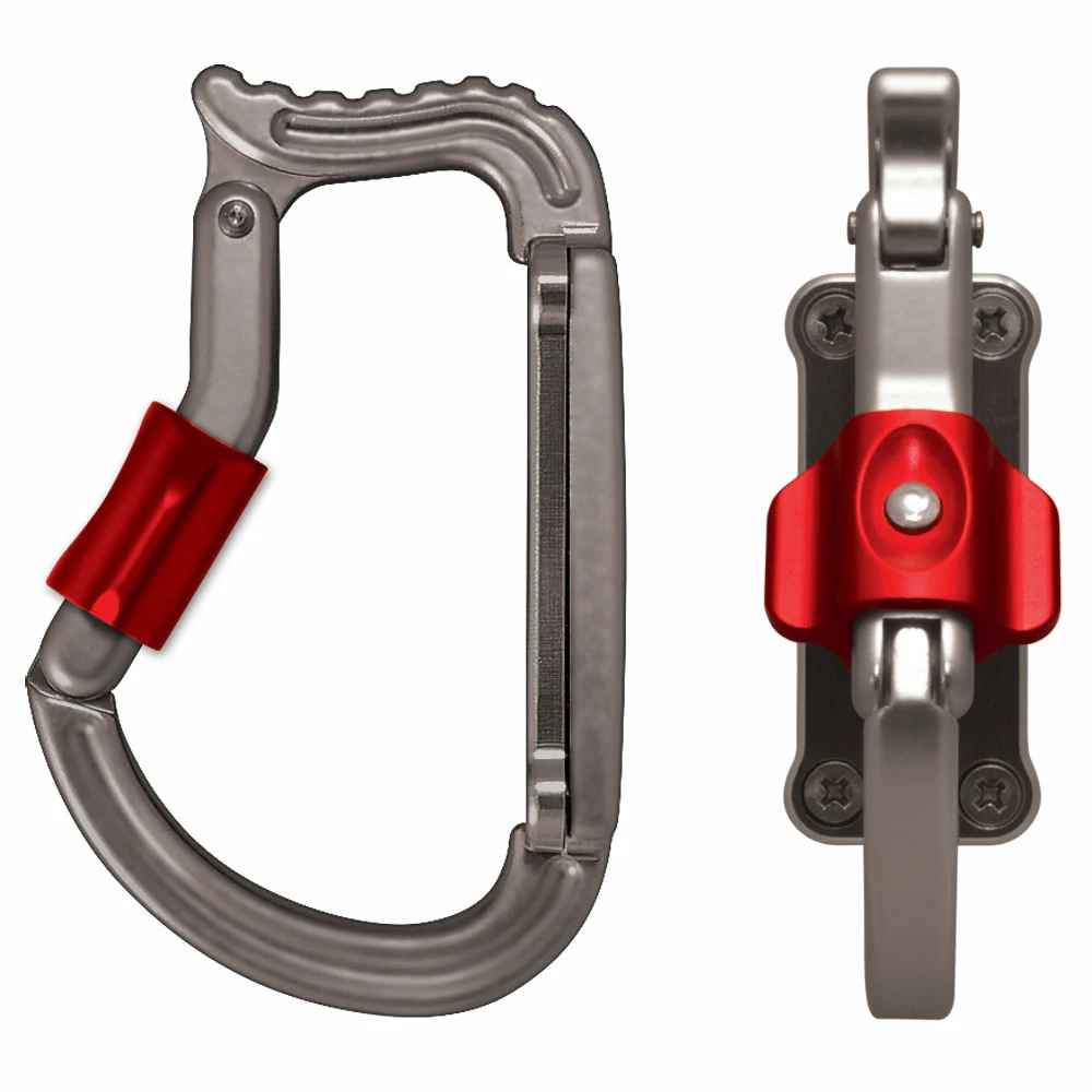 The Rock Exotica transPorter is designed as a harness βtool-holderβ made for ease of use and security. Designed for rigging, industrial work, and big wall climbing, and other situations where you just cannot afford to drop a tool, this is the most bombproof racking ‘biner available. The manual locking gate is a dual push-button design that you can lock if desired to prevent inadvertently snagging or hooking unwanted items. But you can also leave it unlocked when needed so you are able to remove tools quickly without fumbling to repetitively unlock the gate. Unique βwingsβ on the gate allow the user to single-handedly retrieve and sort gear, even with gloves on. The transPorter semi-permanently attaches to the harness, secured by an aluminum plate with removable screws. The wide plate and rigid frame ensure the transPorter will stay in position when used with small or large tools. Machined from solid aerospace grade aluminum.